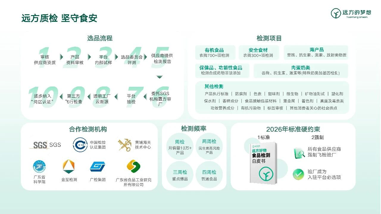 从每一颗鸡蛋的7天一次常态化检测,到每一款产品的定制化检测,远方好物以每年数千万元的检测投入,让“闭眼入、放心买”从承诺变为现实,让食品安全成为平台的最显性的信任标准。